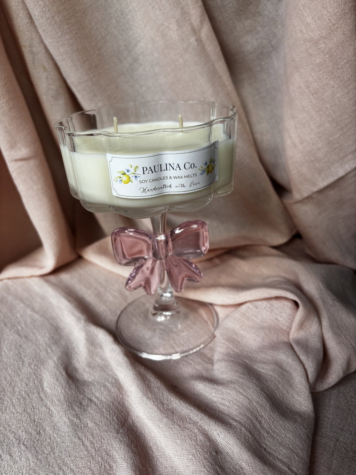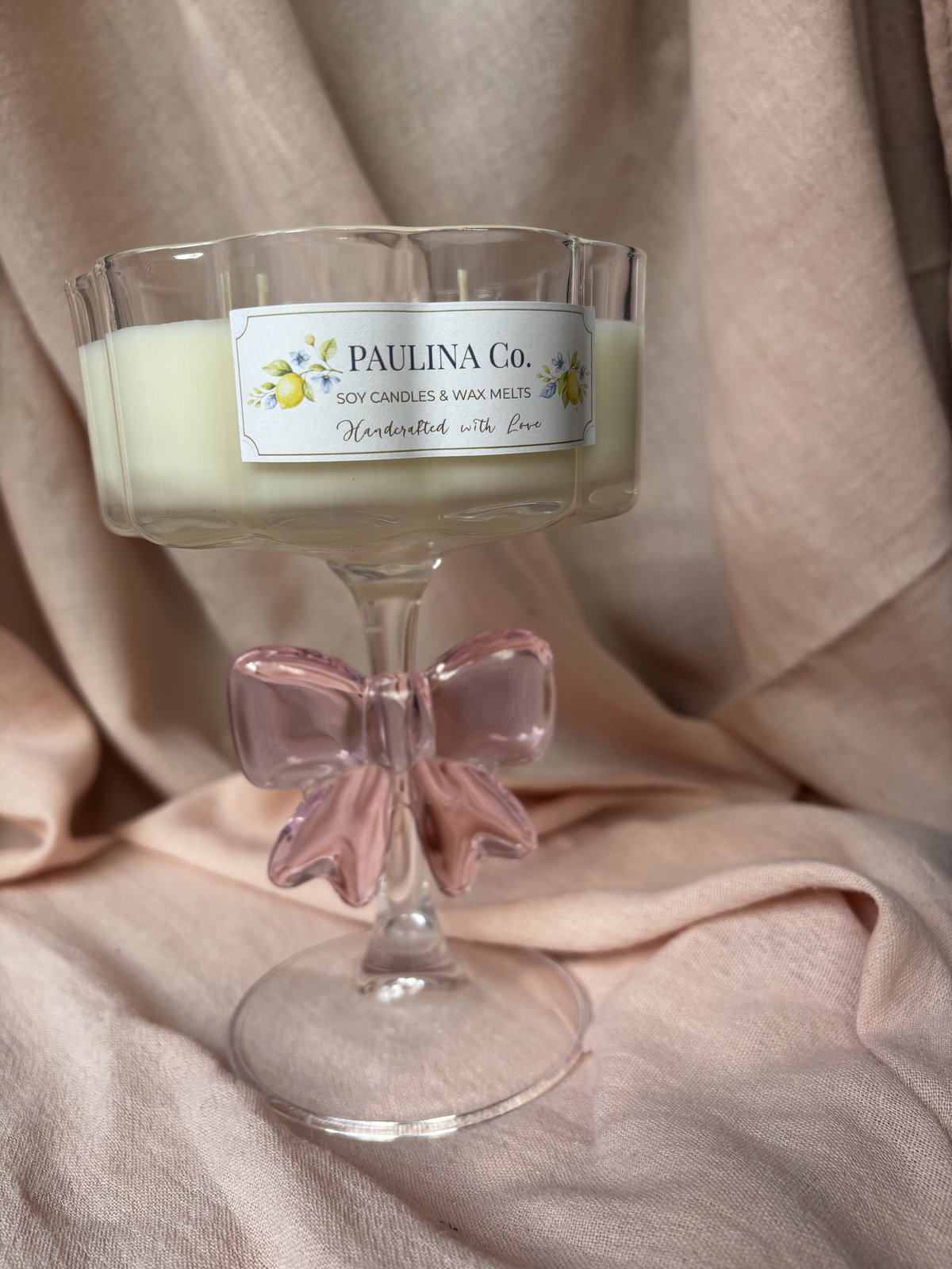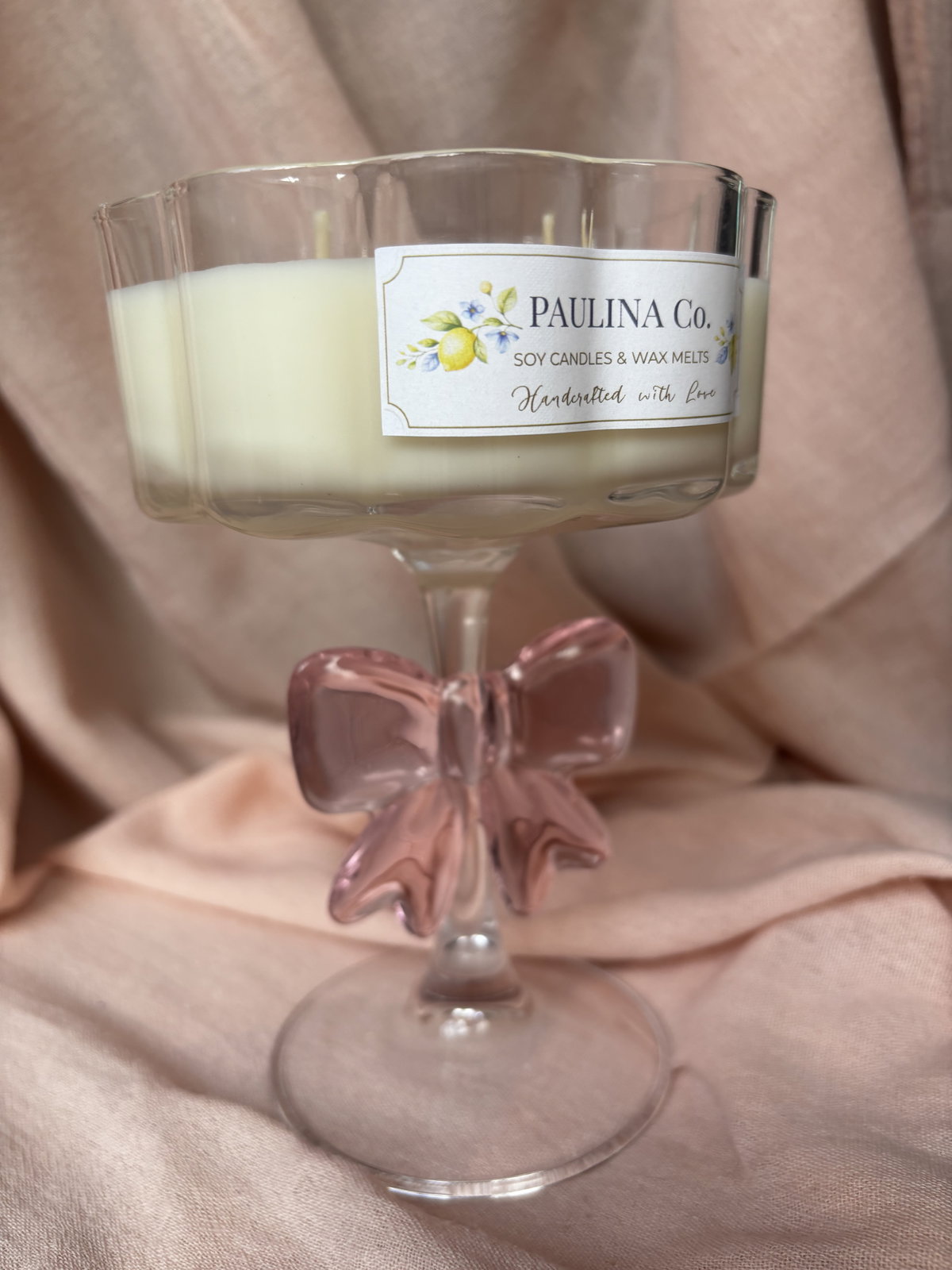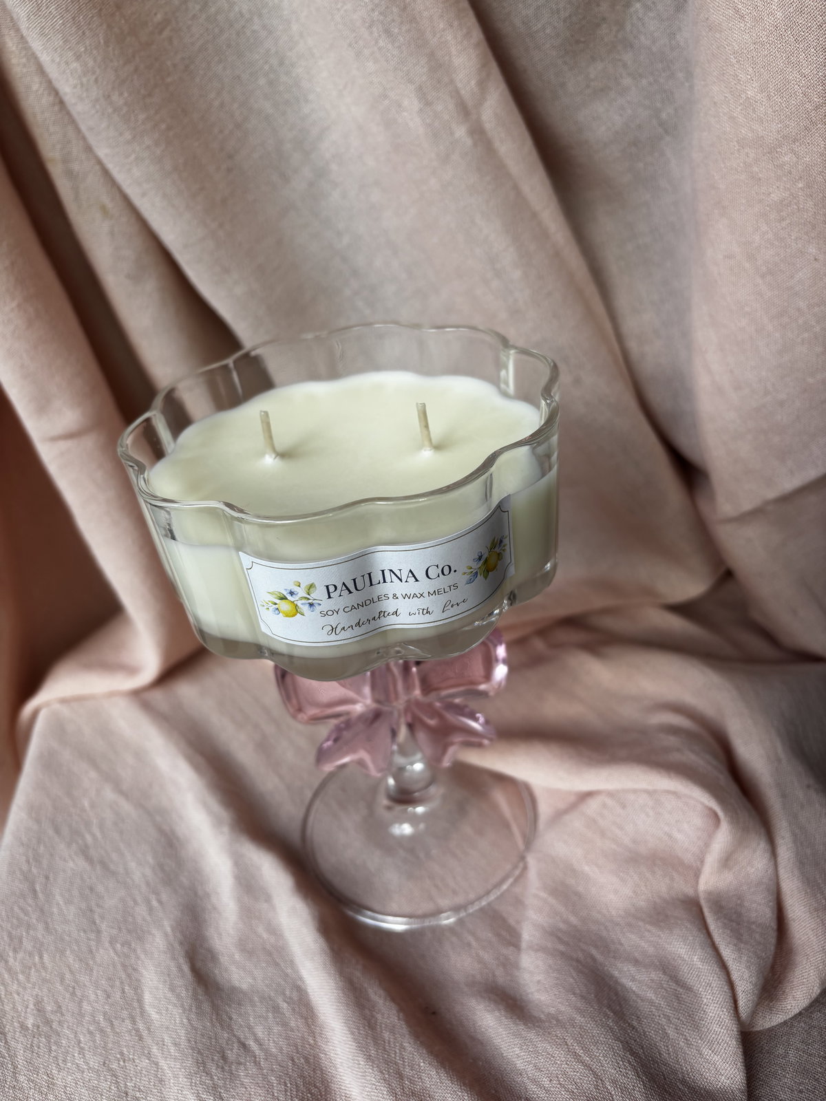 vela hecha con cera de soja y cera en gel en copa de vidrio.